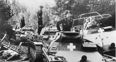 Links: Panzerkampfwagen I und II beim Vormarsch nahe Bromberg im Polnischen Korridor, September 1939. Rechts: General Heinz Guderian im Sd.Kfz. 251/3 (Funk-Kommandofahrzeug mit Rahmenantenne).